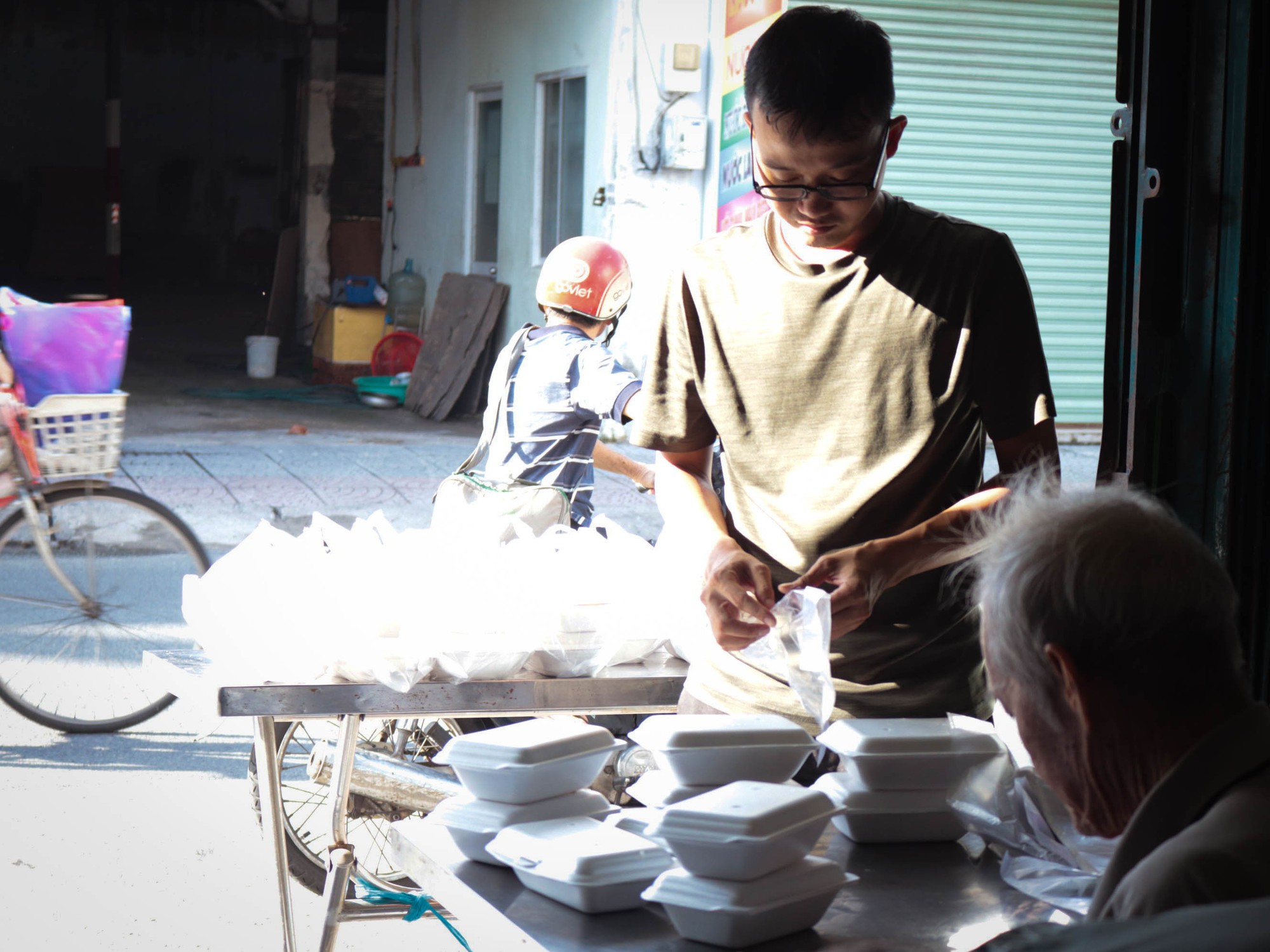 Có người còn đến từ 4 giờ sáng phụ bà nấu ăn rồi mới quay lại với công việc của bản thân. Có người thì đến lúc 7 giờ, phụ cô Kim Khánh đóng gói thức ăn, cũng có những anh chị đến vào tầm giờ chiều để gọt rau củ, chuẩn bị phần thức ăn cho ngày mai. Luôn luôn, lúc nào trong nhà ông bà cũng có những tấm lòng của người trẻ sẵn sàng giúp đỡ.