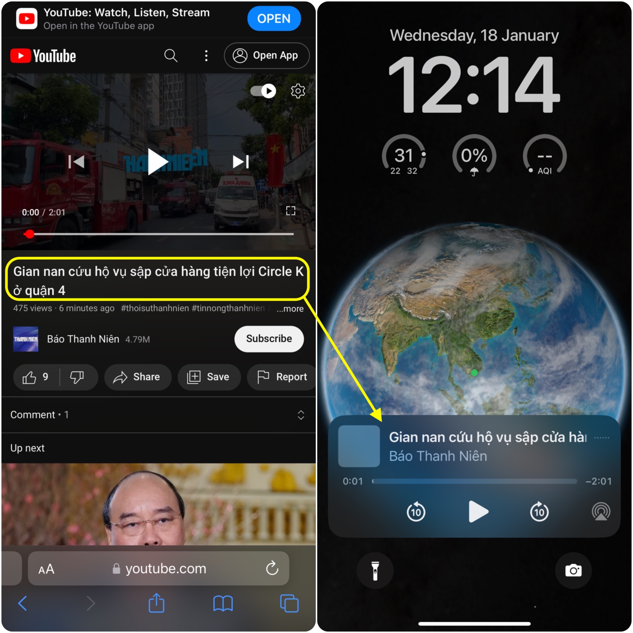 Bạn không cần đăng nhập hoặc đăng nhập để bật màn hình khi bật. iPhone mà chỉ cần vuốt từ góc bên phải màn hình xuống để truy cập Control Center. Khi bạn bấm Play và nội dung đó sẽ tiếp tục phát ngay cả khi bạn tắt màn hình iPhone, lúc này ở khu vực nút Play đã có tên video YouTube bạn bật trước đó.